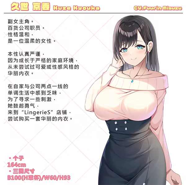 在「LingerieS」工作期间,苍逐渐了解了女性内衣的深奥学问,并与来店的女性顾客交流,建立起深厚的羁绊——。