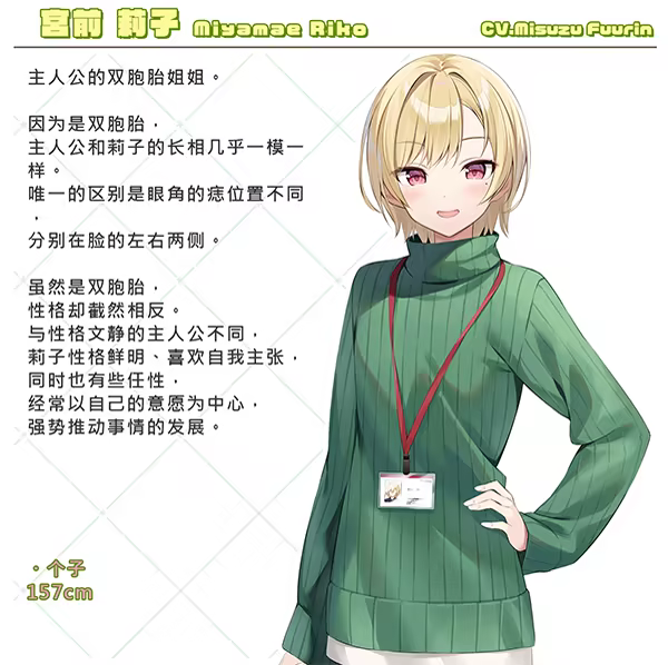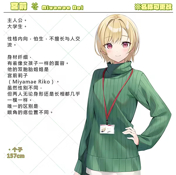 苍有一个双胞胎姐姐,宫前莉子。尽管性别不同,但两人无论是外貌还是长相都几乎一模一样。